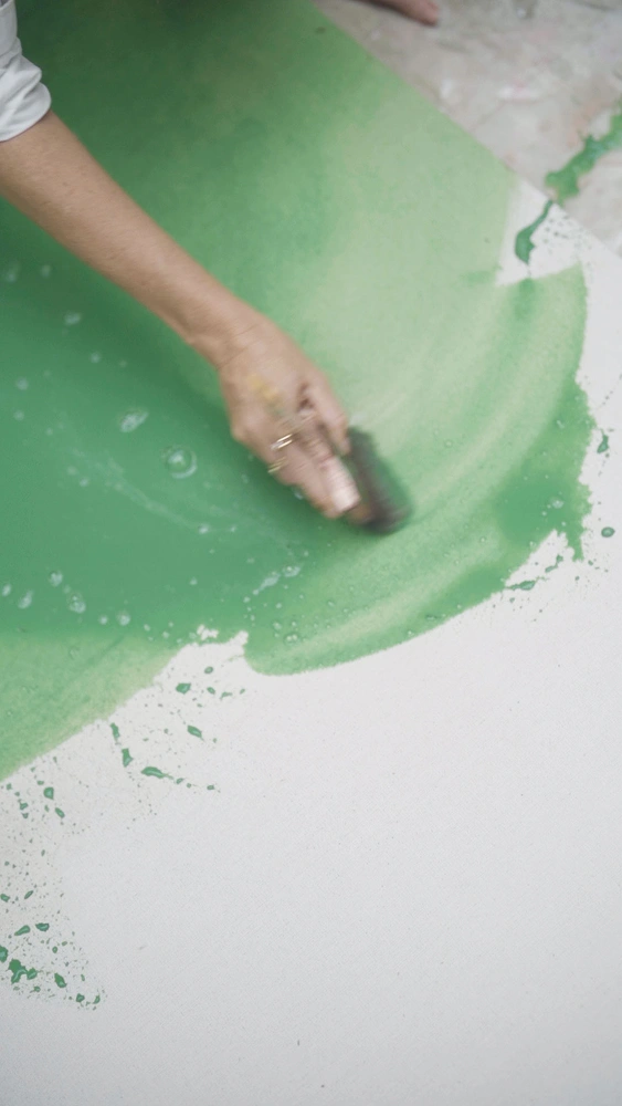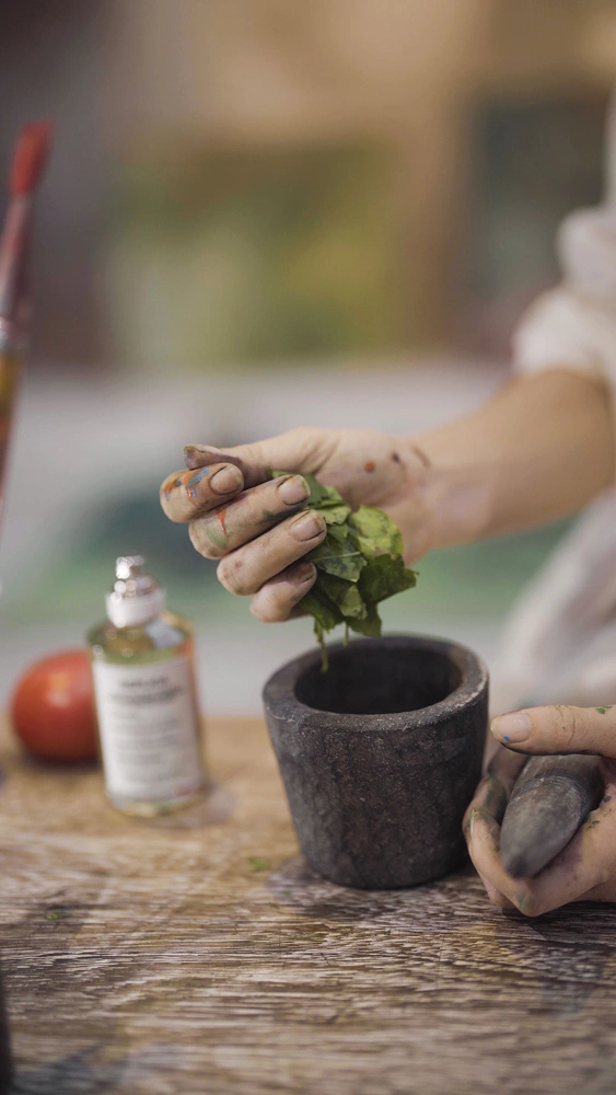 We filmed at the base of a volcano on a tomato farm, where I gathered tomato leaves to create natural pigments and collected volcanic ash to add to my apothecary of organic mediums. These elements drawn directly from the environment that inspired the fragrance's top notes were incorporated into an artwork created specifically for From the Garden.